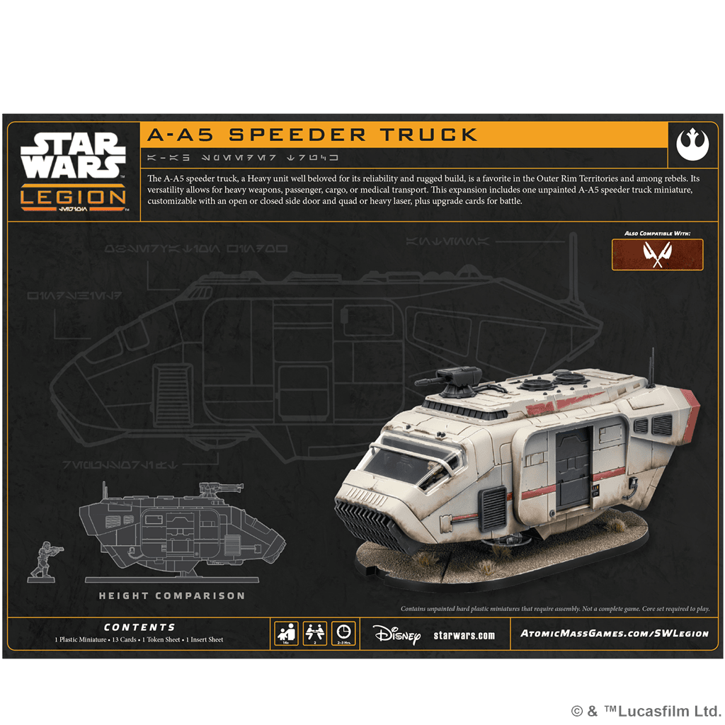 Prepárate para causar sensación (y algo de caos controlado) en tus partidas de Star Wars: Legion con el A-A5 Speeder Truck, un vehículo pesado, resistente y versátil que se ha ganado su sitio tanto entre contrabandistas del Borde Exterior como en las filas de la Alianza Rebelde. ¡No será rápido, pero te aseguro que llega y aguanta!