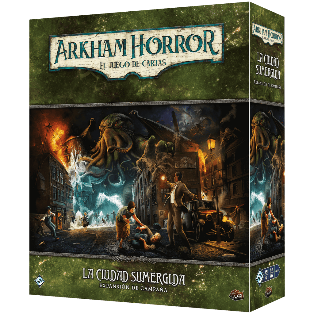 La Ciudad Sumergida, una expansión de campaña de 1 a 4 jugadores, te desafía a enfrentarte a los misterios y peligros de R’lyeh. A medida que la ciudad se alza de las profundidades, los investigadores tendrán que recorrer sus laberínticos corredores, escalar ruinas inestables y estudiar artefactos alienígenas que cuentan la historia de una civilización perdida. Los jugadores explorarán el fondo oceánico, esquivarán trampas de otras eras y enfrentarán criaturas más antiguas que la humanidad misma. La campaña cambia y evoluciona con cada elección, haciendo que cada partida sea una experiencia única que culmina en un enfrentamiento épico con Cthulhu.