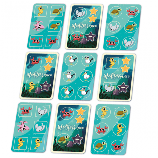 Juego de mesa abstracto de 18 cartas para dos jugadores donde realizaremos una expedición subacuática por el Mediterráneo. Los jugadores deberán formar un mar común de cartas en el que irán apareciendo u ocultándose distintas criaturas marinas puntuando para cada uno de distinta manera.