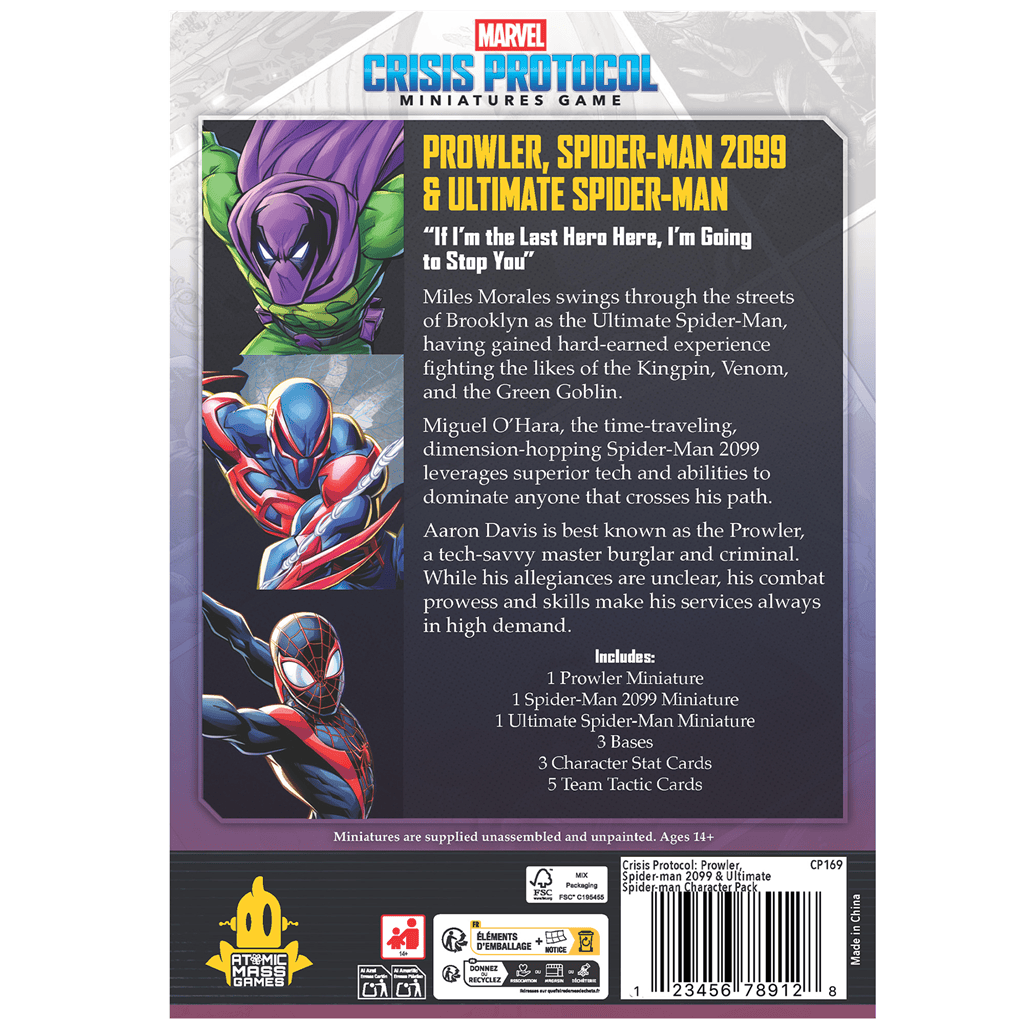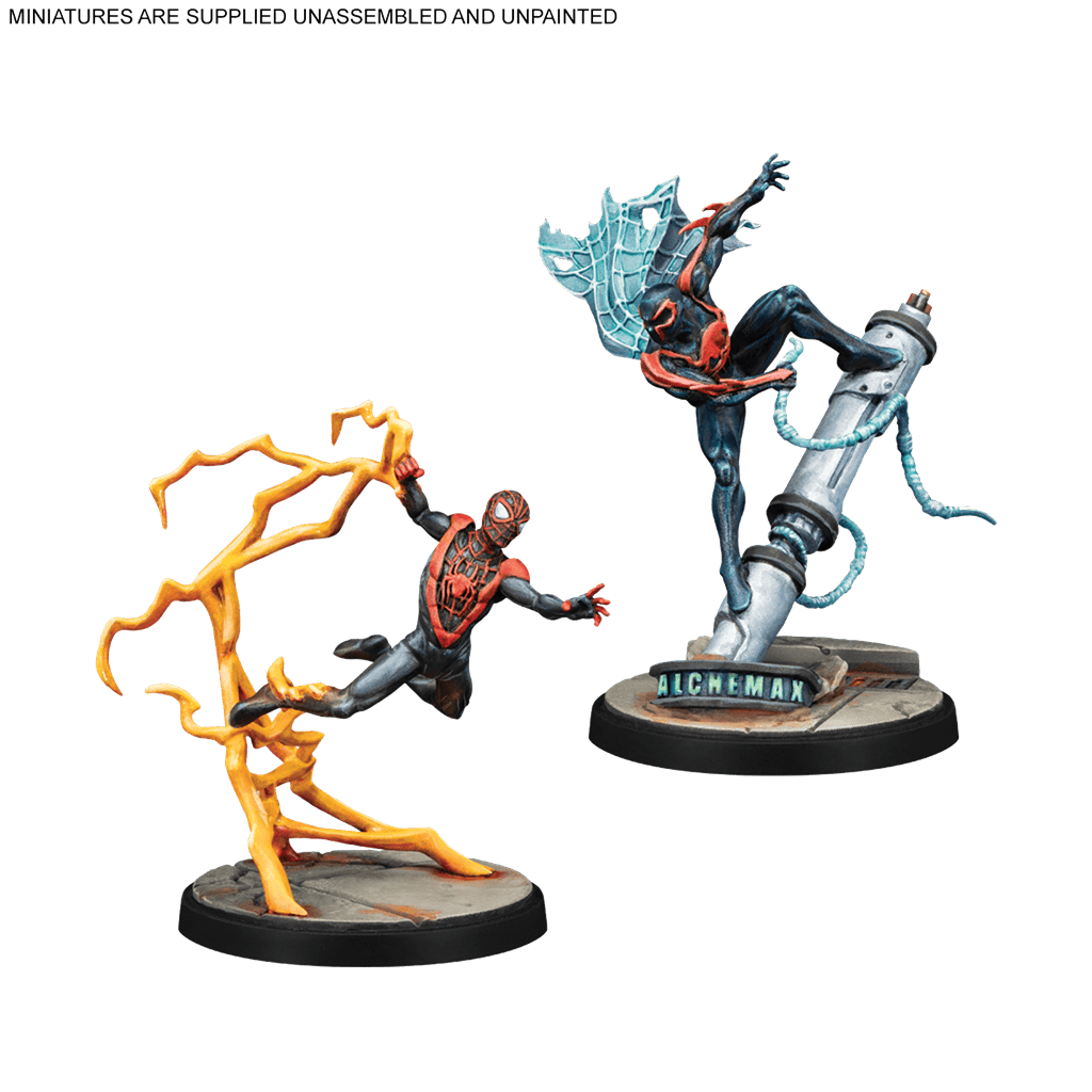 Desde los callejones de Brooklyn hasta los rascacielos del futuro, este paquete de personajes para tu juego de miniaturas trae a tres figuras legendarias del Spider-Verso, cada uno con su historia, habilidades únicas y un montón de telarañas (¡algunas más tecnológicas que otras!).
