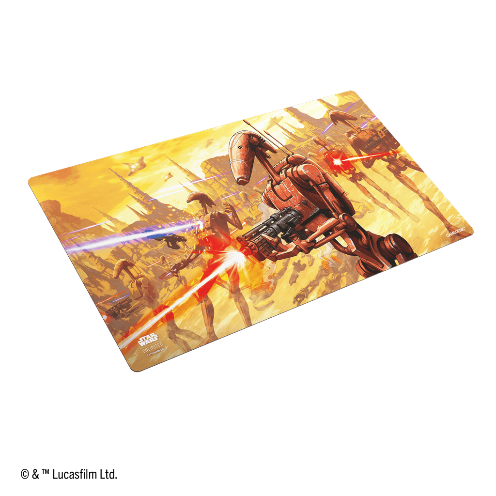 ¡Prepárate para desplegar tus tropas con el Unlimited Game Mat: Battle Droids de Star Wars™! Este espectacular tapete es perfecto para los jugadores que desean que su campo de batalla tenga un toque temático y lleno de acción. Con un diseño que destaca a los infames droides de combate de la Confederación de Sistemas Independientes, cada partida se sentirá como si estuvieras coordinando un ejército de máquinas en plena Guerra de los Clones.