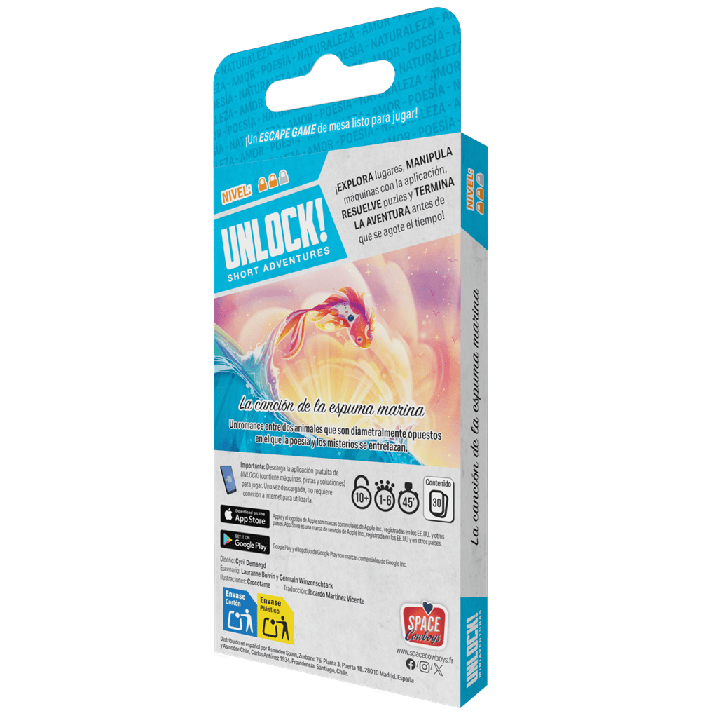 ¡Prepárate para sumergirte en una aventura como ninguna otra! En Unlock! Mini: La canción de la espuma marina, los enigmas no vienen solos: llegan acompañados de romance, poesía y criaturas marinas que te robarán el corazón (y tal vez alguna pista).